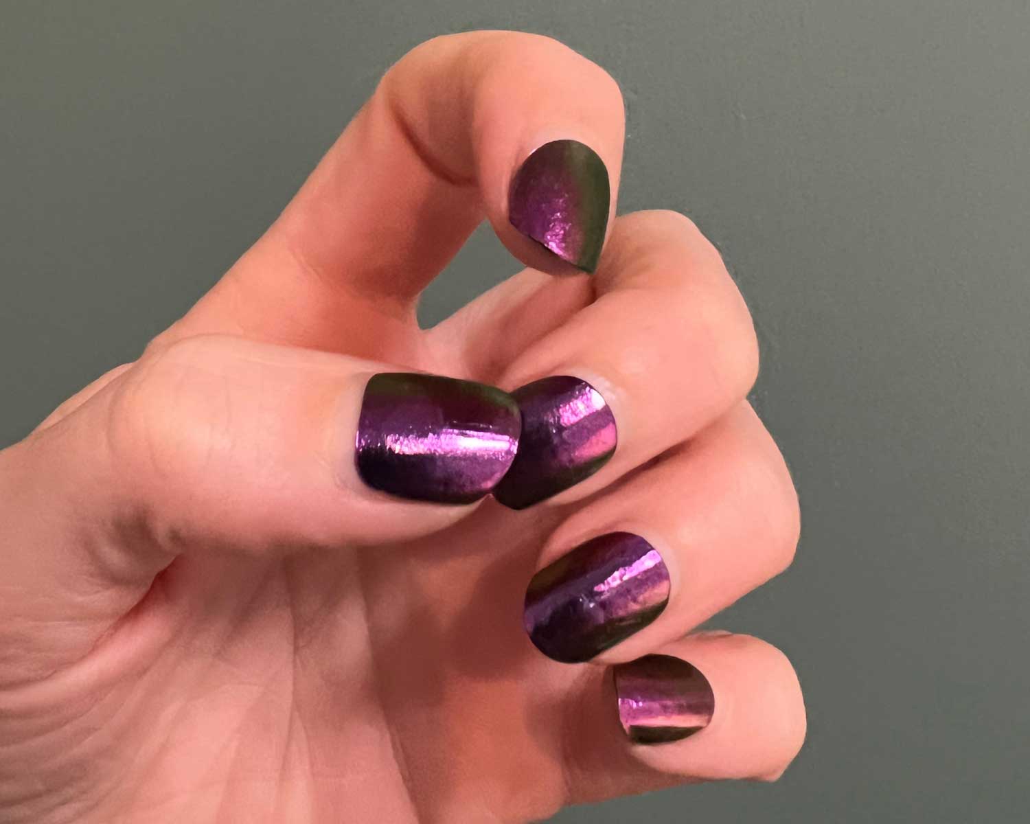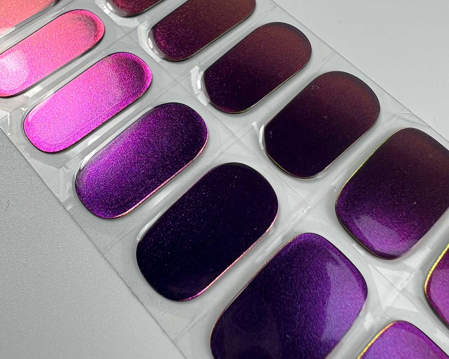 A captivating blend of deep plum and shimmering violet, Amethyst Eclipse semi-cured gel nails shift in tone from dark purple to radiant lilac, occasionally revealing hints of coppery warmth depending on the angle and light. A bold, dimensional manicure perfect for those who love elegance with a twist.