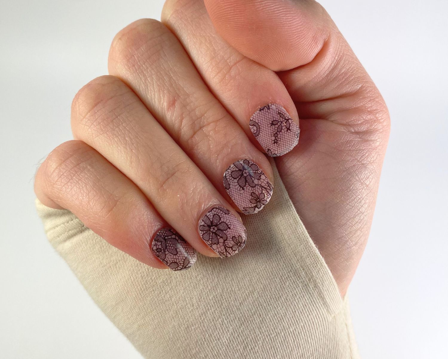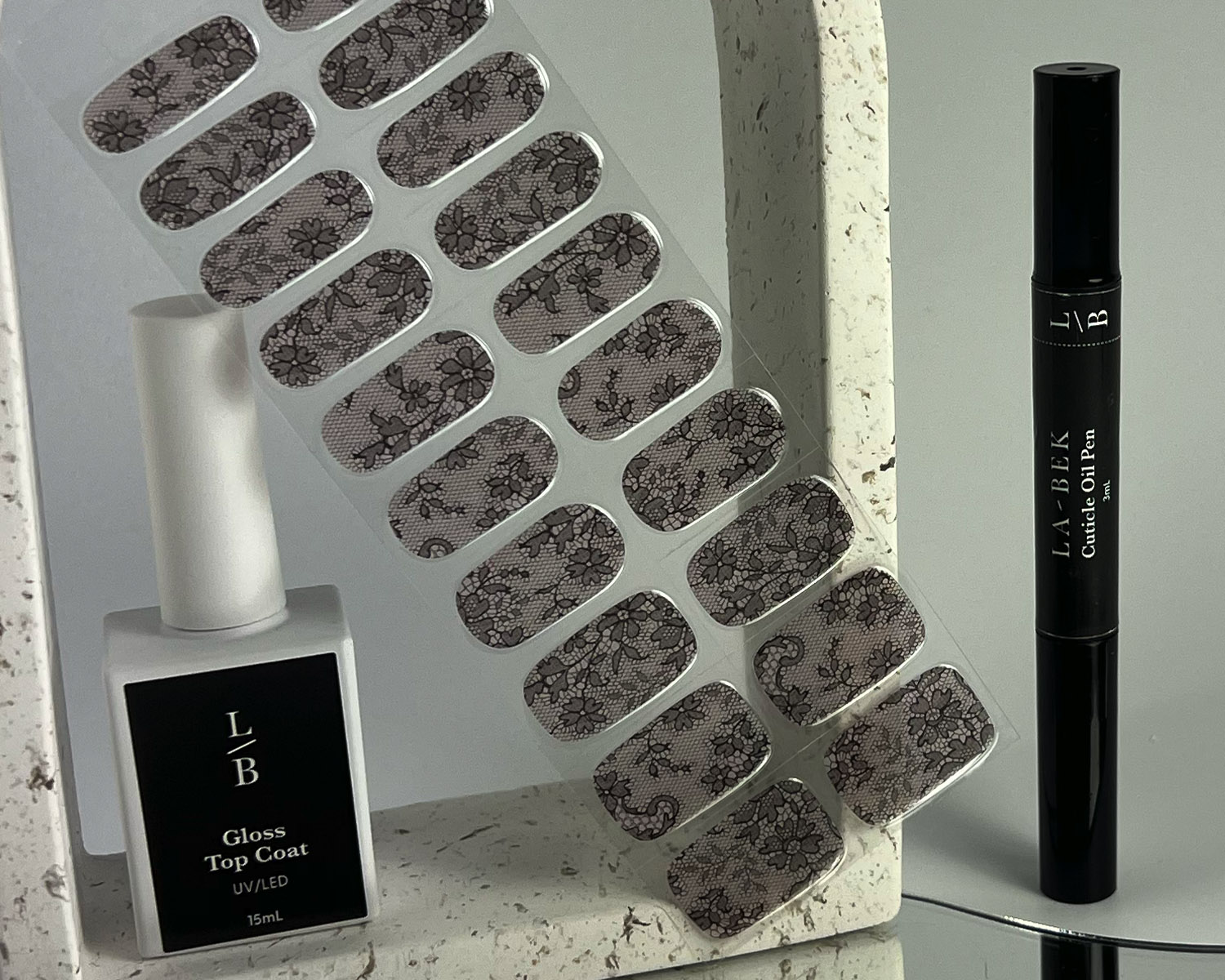 Add a little drama to your fingertips with Black Lace. Featuring a semi-transparent base and intricate black lace detail, this design is the perfect mix of elegance and edge. A must-have for statement lovers and moody mani days.