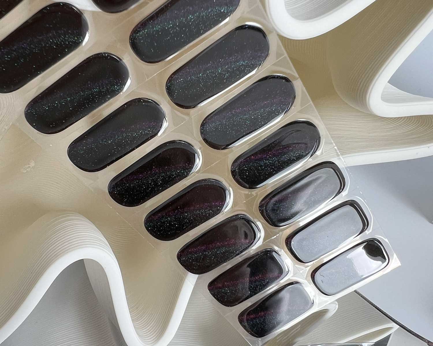 Make a bold statement with Black Panther Cat’s Eye — a rich, jet-black base infused with a blue-green cat’s eye shimmer and scattered micro-glitter. This magnetic semi-cured gel nail strip delivers drama and depth, giving you a sleek, salon-quality manicure in minutes — only from La-bek.