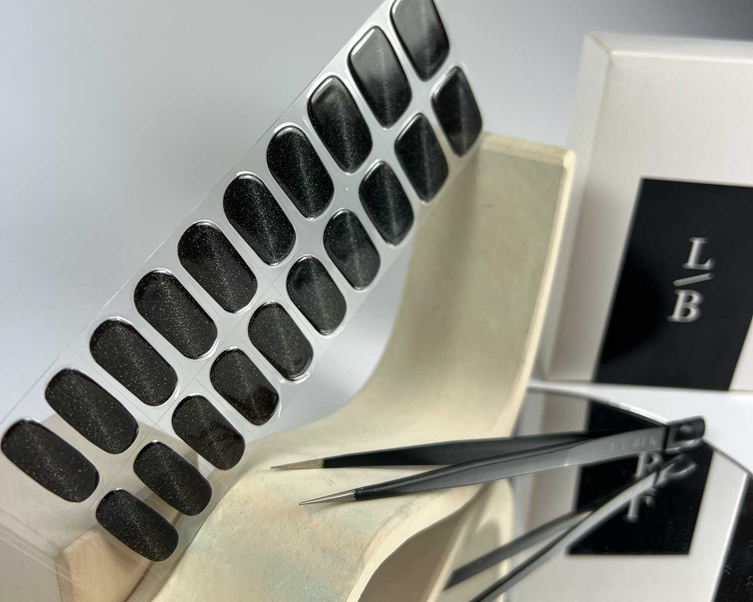 2. Choose & Place Your Sticker: Using tweezers, gently peel off your chosen sticker—taking care not to tear it. Place it on your nail in the desired position. For best results, press it down gently with the rubber tip of your LA-BEK tweezers to smooth and secure it.