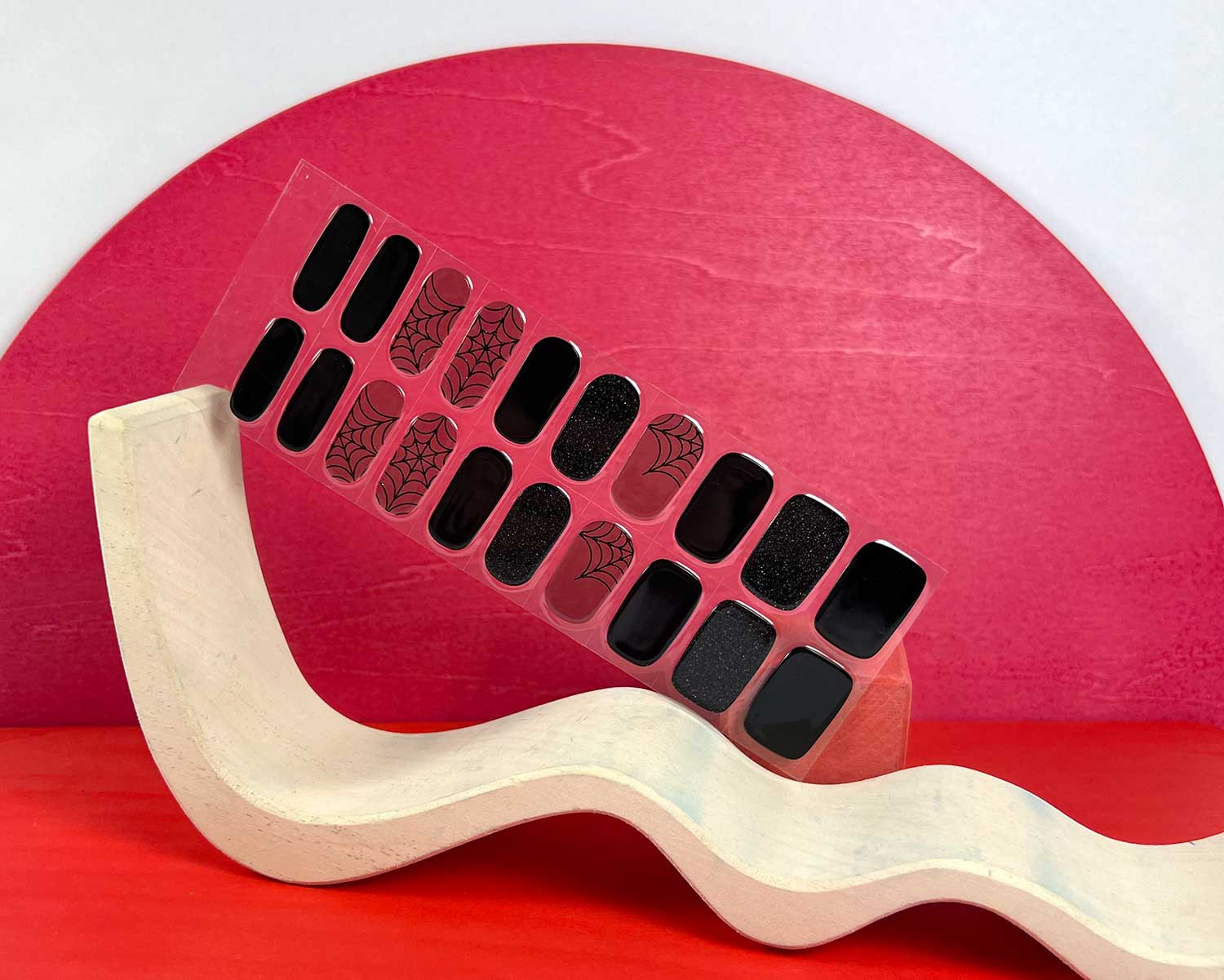 A striking mix of solid black, glitter accents, and glittery spider web graphics, Black Widow brings drama and elegance to your manicure.