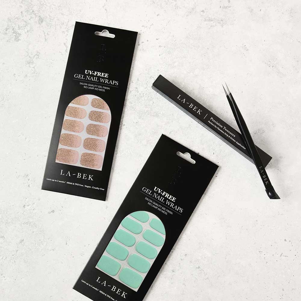 This starter set includes Pacific Blue and Pink Champagne nail sets plus Precision Nail Tweezers — everything you need to try La-Bek for the first time with zero guesswork.