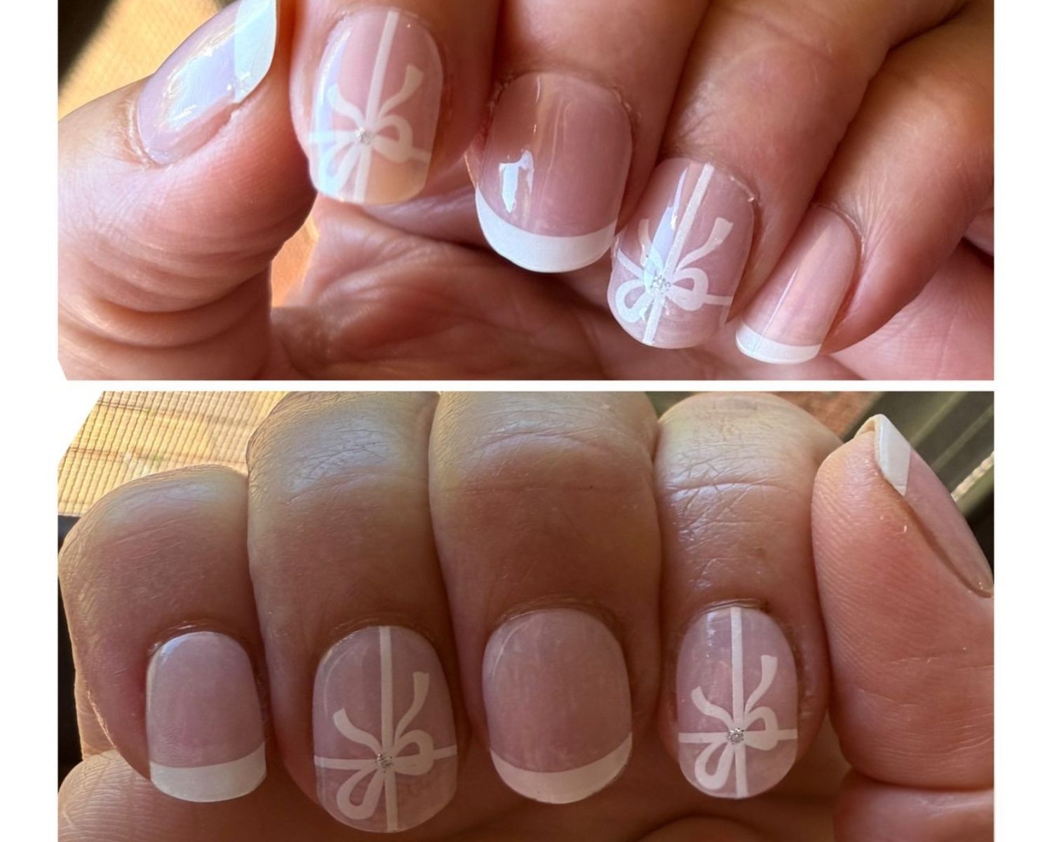 Introducing French Noel, a holiday-inspired take on the classic French manicure. Featuring delicate white French tips accented with shimmering glitter and a charming bow design, this set is the perfect blend of sophistication and festive cheer.