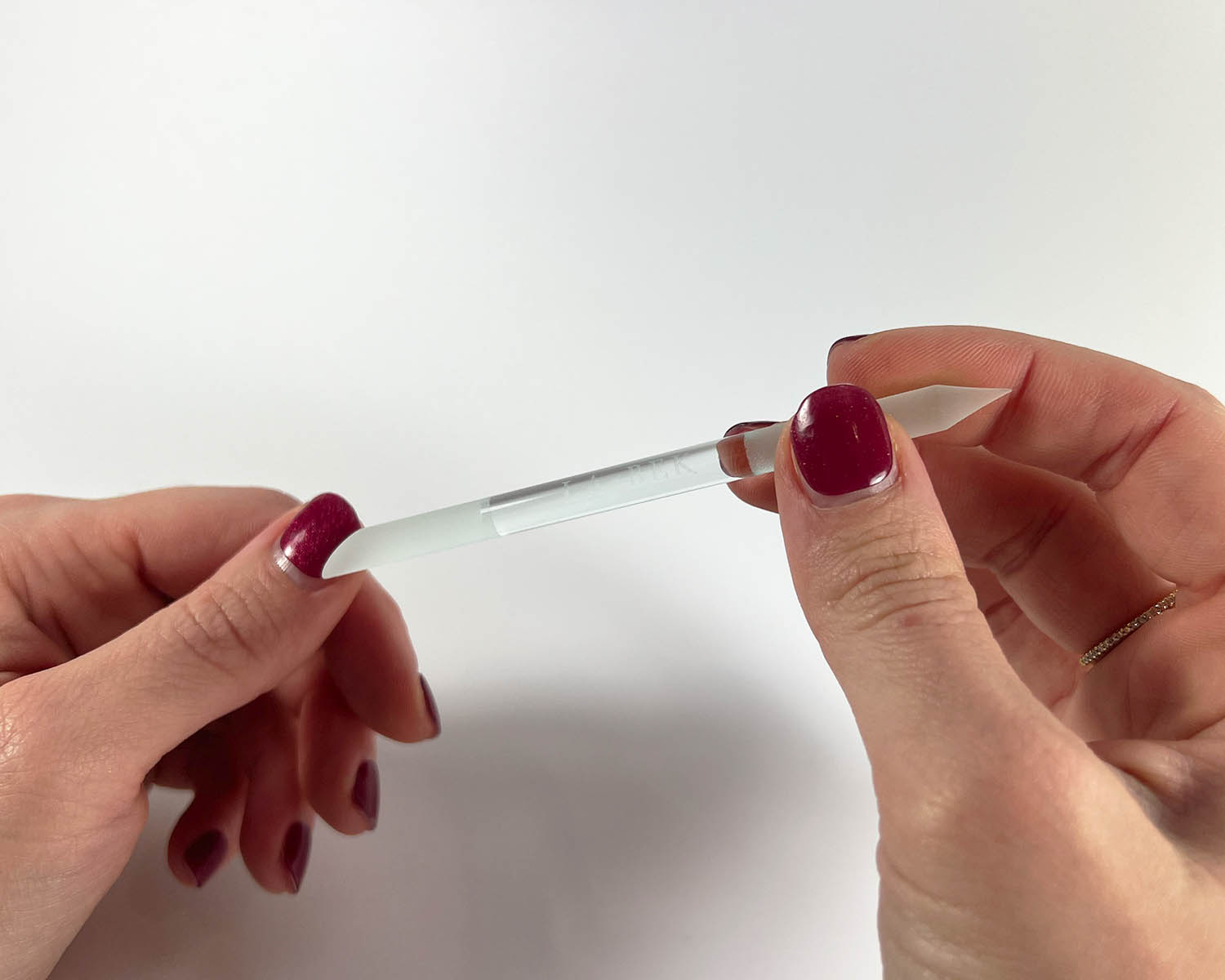 - Clean up the edge of your nail with the provided nail file, making sure to file in one downward direction.