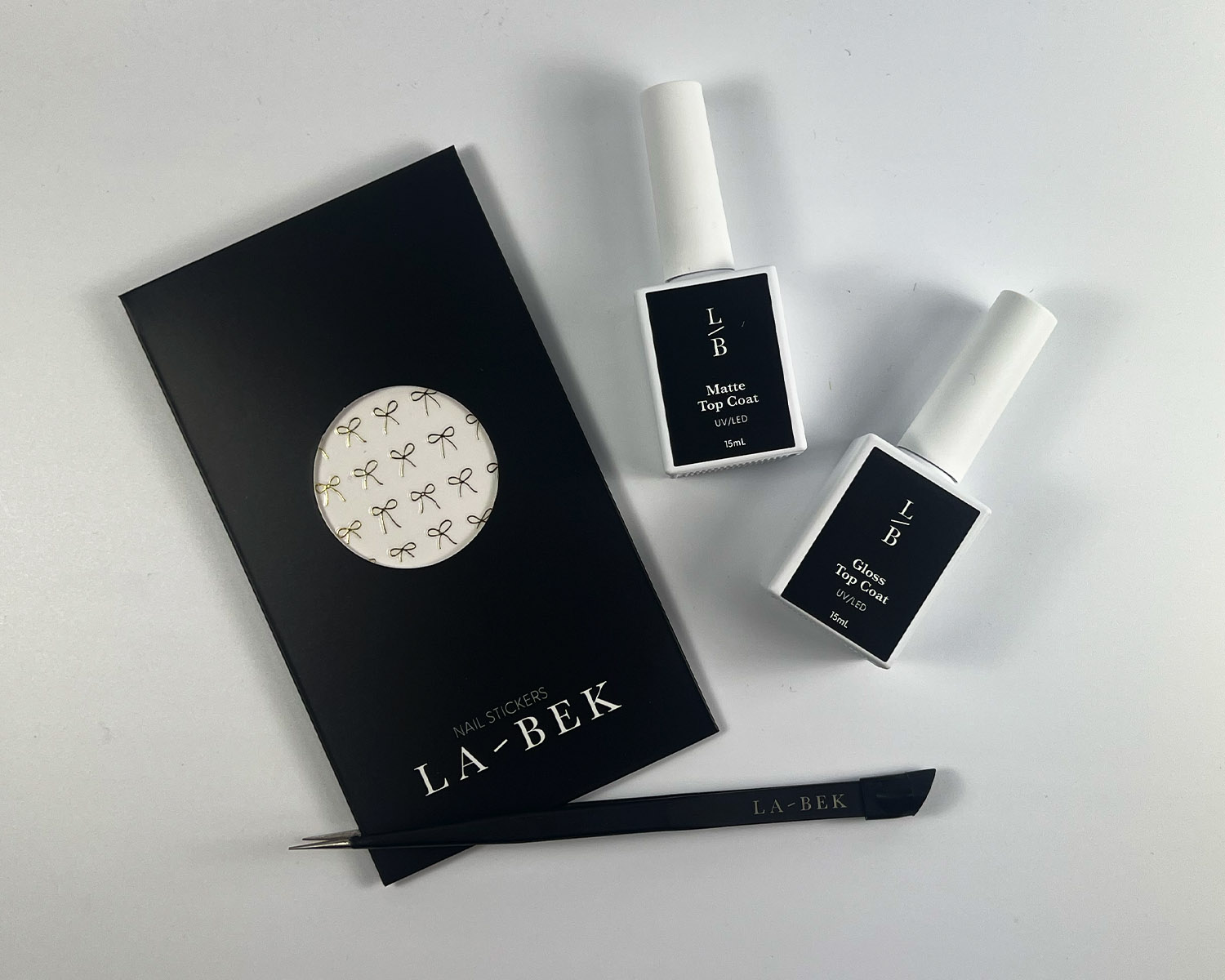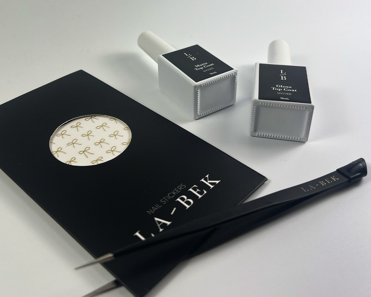 3. Seal with Top Coat: Apply a thin, even layer of LA-BEK Gloss or Matte Top Coat over the entire nail to lock the sticker in place.