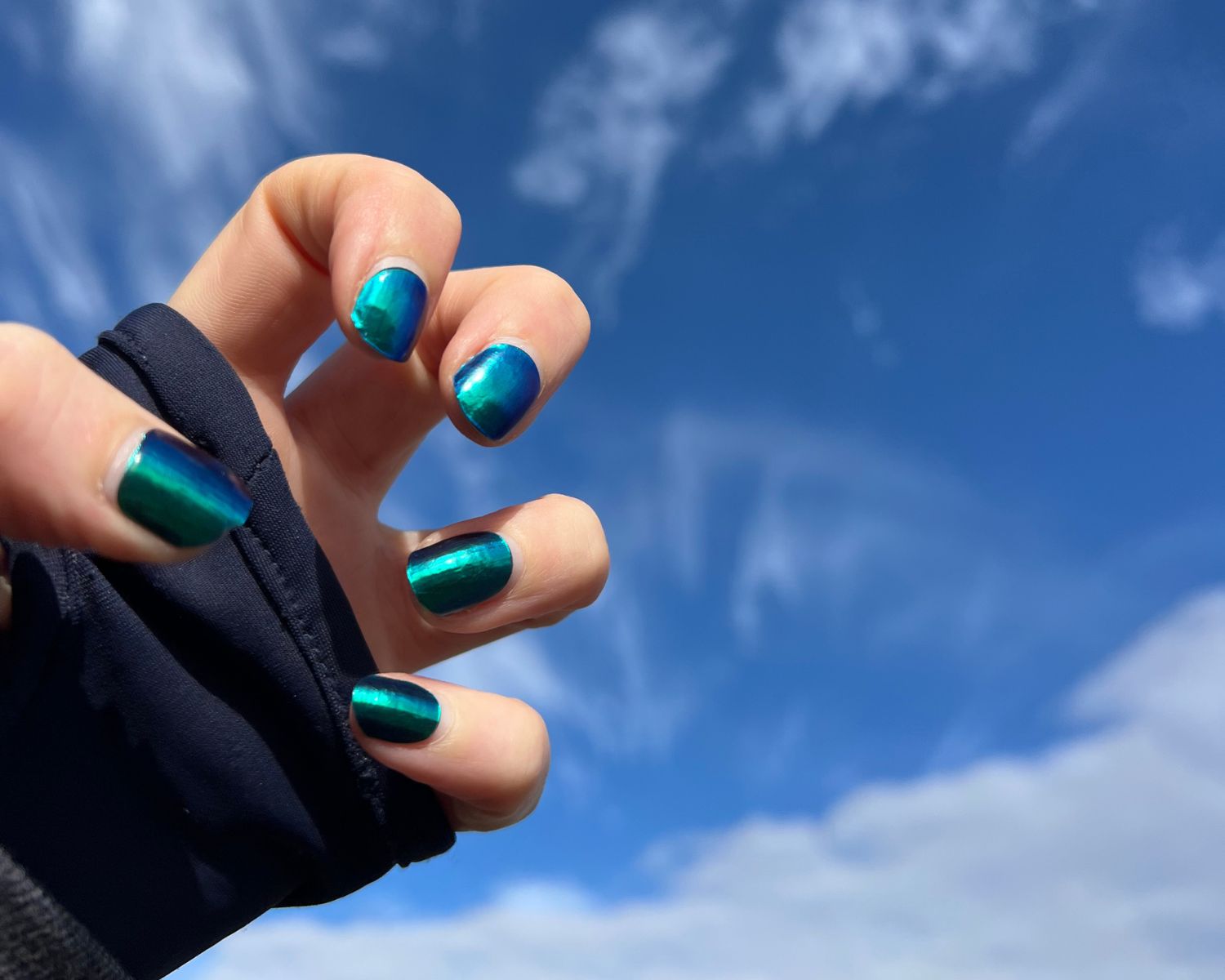 Bold and luminous, Jade Eclipse brings the drama. These semi-cured gel nails feature a rich jade green base that shifts to deep emerald and electric blue depending on the light. With their dynamic colour play and sleek finish, they’re made to turn heads.