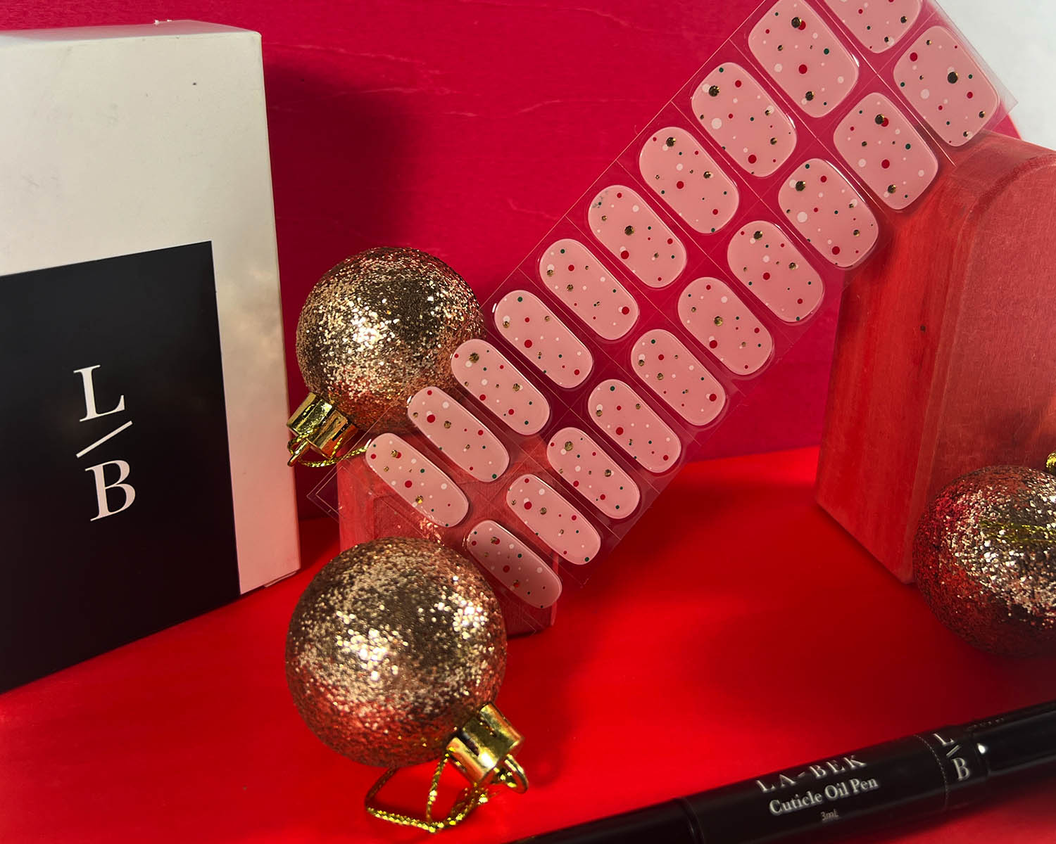 Get ready to sprinkle some holiday cheer with Jingle Dots, a whimsical and festive design perfect for the season. Featuring a soft pink base adorned with vibrant red, green, white, and shimmering gold dots, this design is all about capturing the fun and joy of Christmas in a playful yet elegant way.