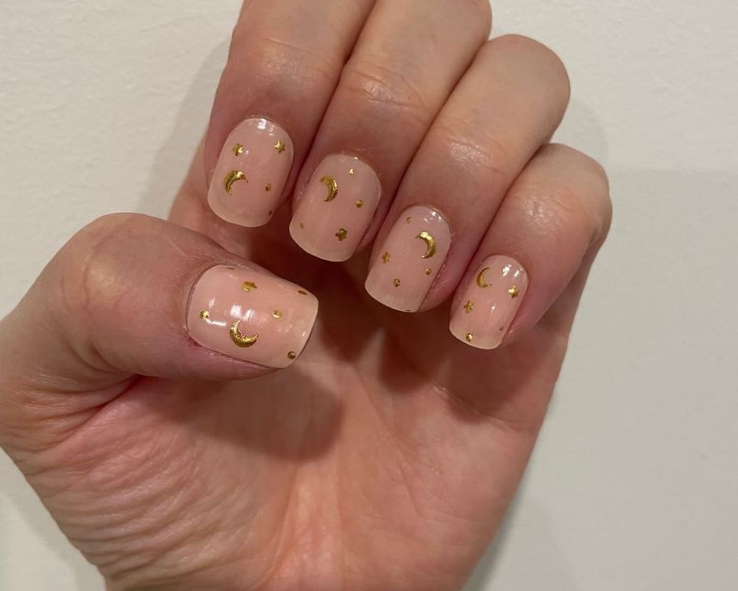 Embrace celestial beauty with Moon Child, a dreamy nail shade adorned with golden crescent moons and stars atop a soft peach base, evoking a sense of enchantment and wonder.