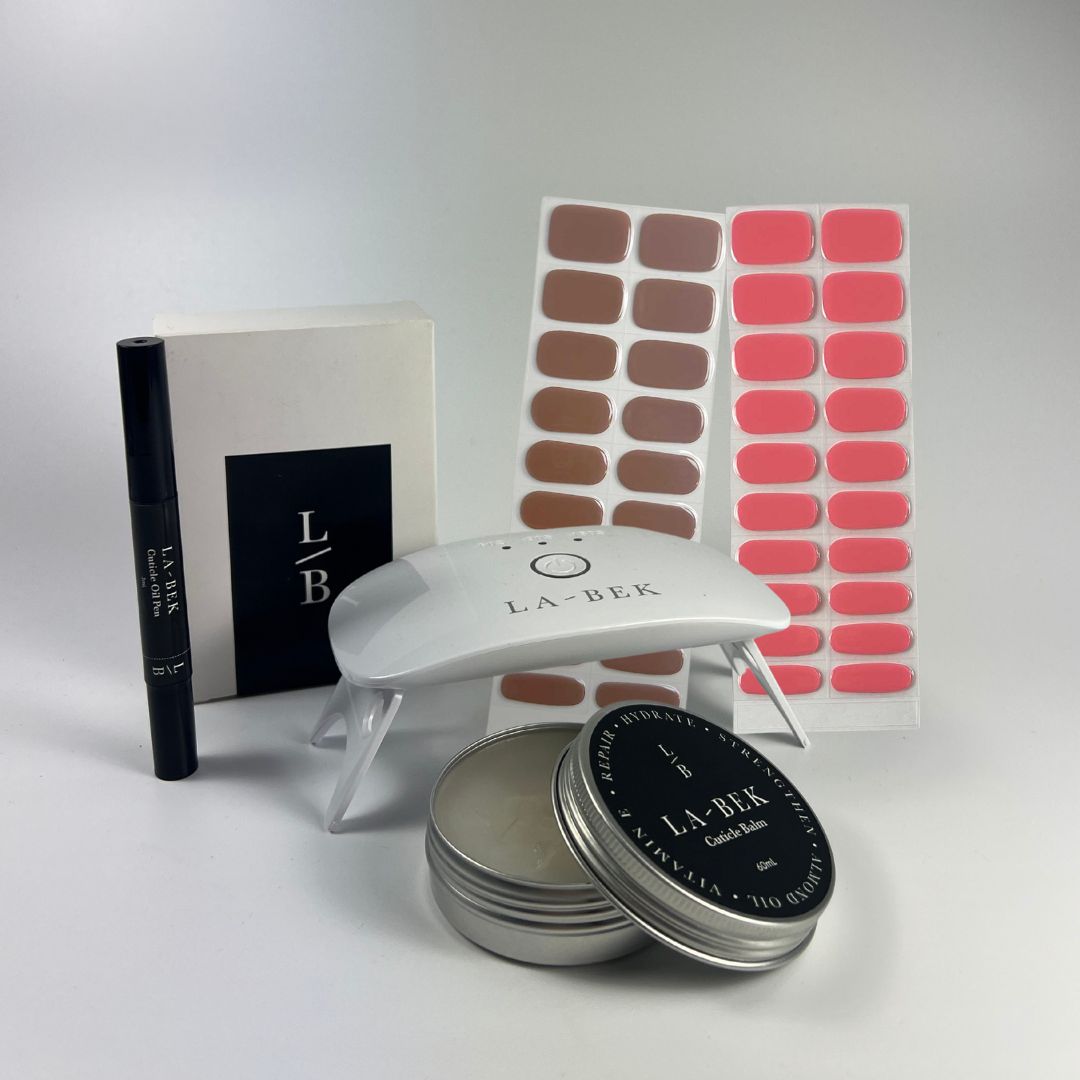 Includes Mocha and Watermelon nail sets, UV lamp, Cuticle Oil Pen, and nourishing Cuticle Balm — your gentle, growth-focused La-Bek start.