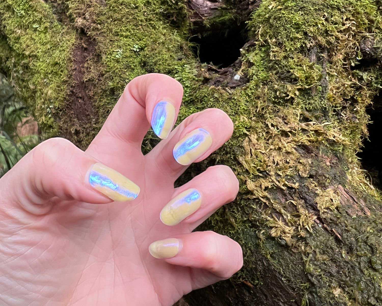 This delightful shade of lemon yellow is infused with pearlescent shimmer, creating a stunning iridescent effect that catches the light with every movement.