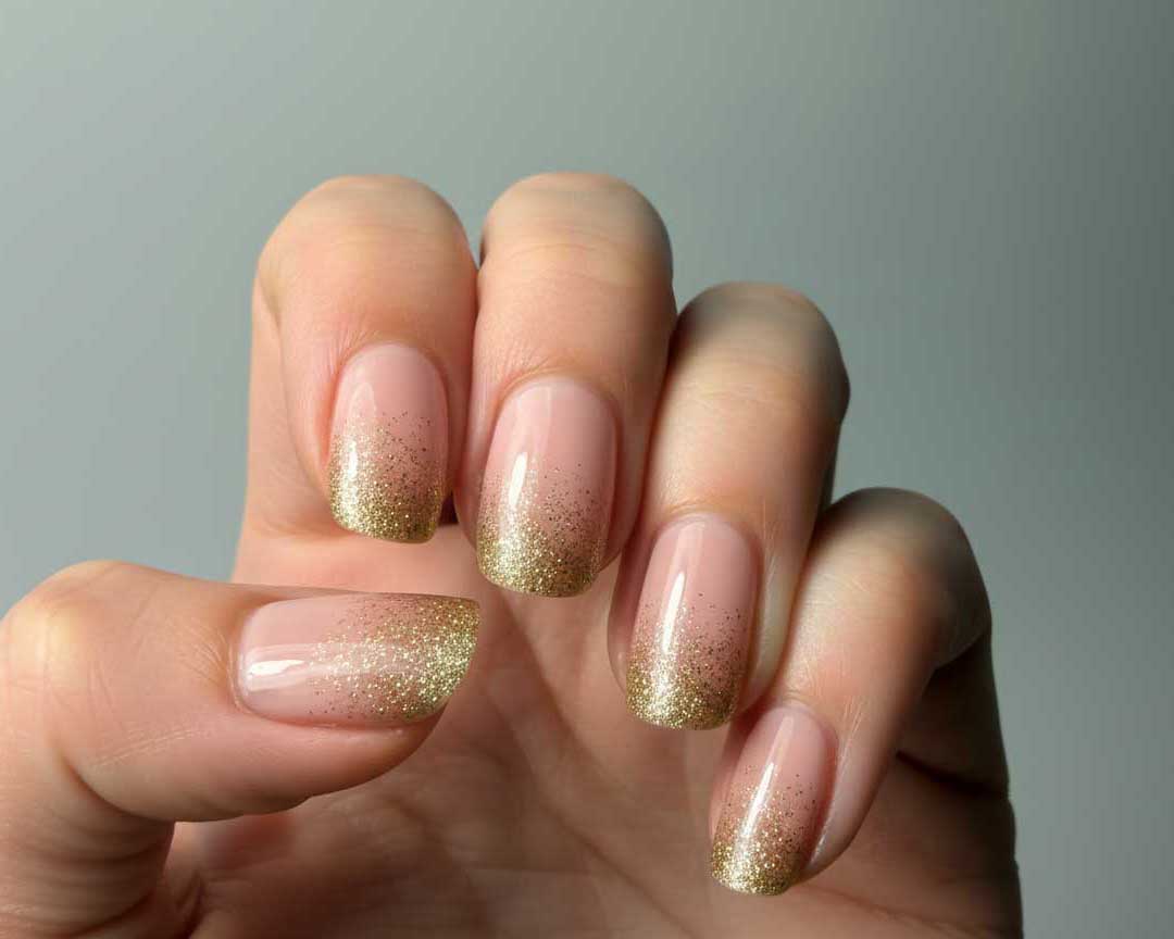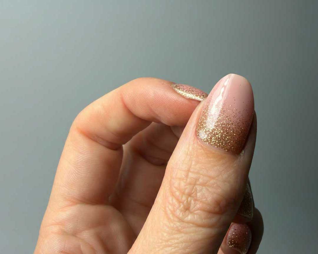 UV Free Gel Nail Wrap – Soft Pink Nails with Gold Glitter Tips, No Lamp Needed