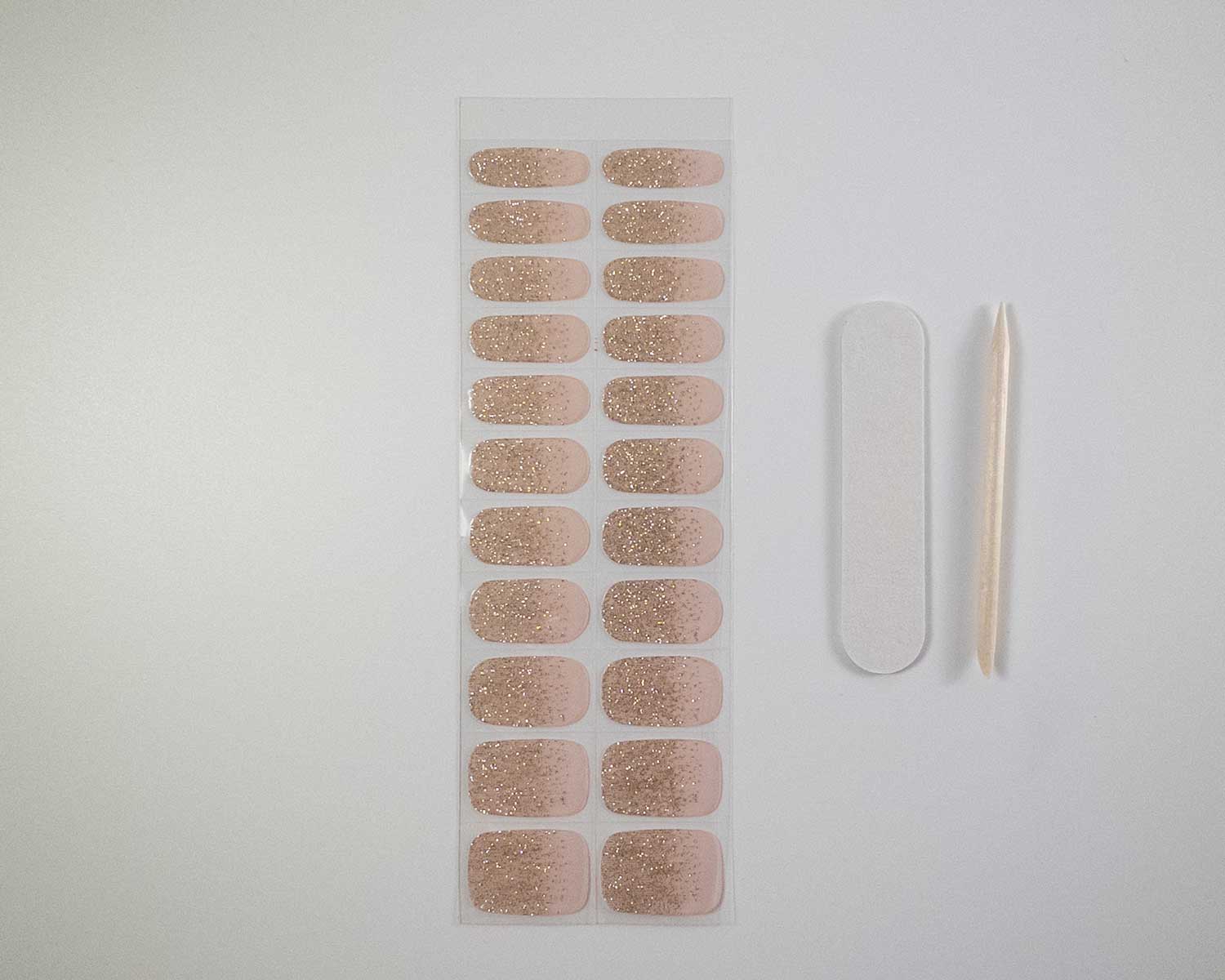 Pink Champagne is a UV Free Gel Nail Wrap featuring a soft blush pink base and elegant gold glitter gradient tips — ideal for glam events or elevated everyday wear. These fully cured wraps give you a salon‑worthy, glitter‑dipped manicure without the need for UV or LED lamps.