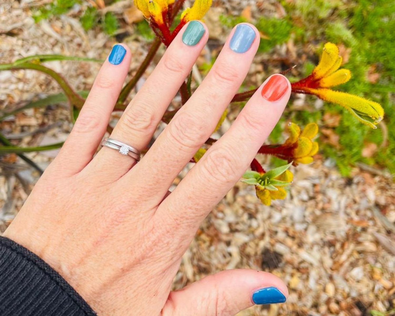 Drift into a world of whimsy with Rainbow Dreams, featuring vibrant blue, green, orange, and red hues for a playful and sophisticated manicure.