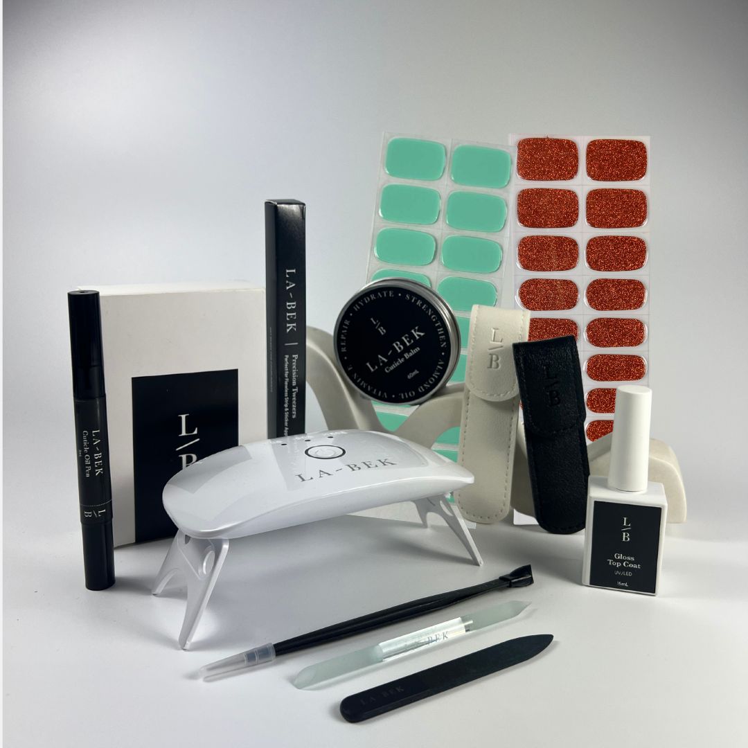 Includes Showgirl Orange and Aqua, UV lamp, cuticle oil pen, tweezers, glass tools — plus our Gloss Top Coat and nourishing Cuticle Balm for the ultimate La-Bek finish.