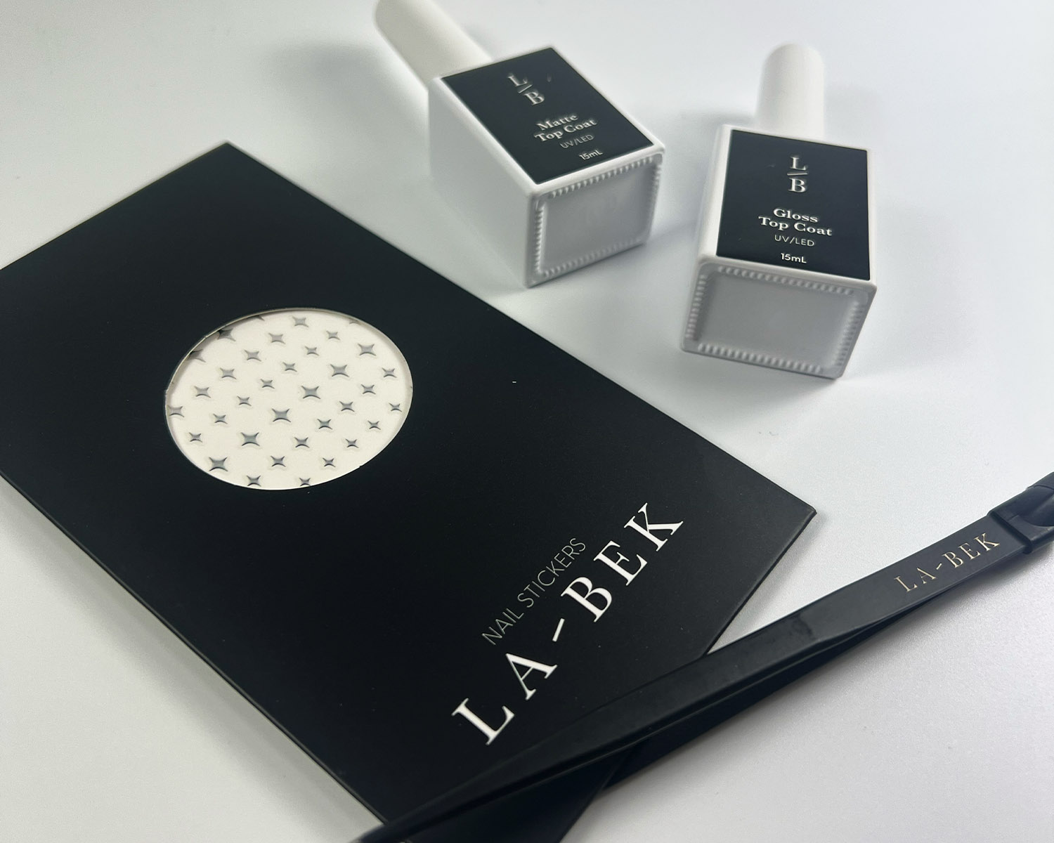 3. Seal with Top Coat: Apply a thin, even layer of LA-BEK Gloss or Matte Top Coat over the entire nail to lock the sticker in place.
