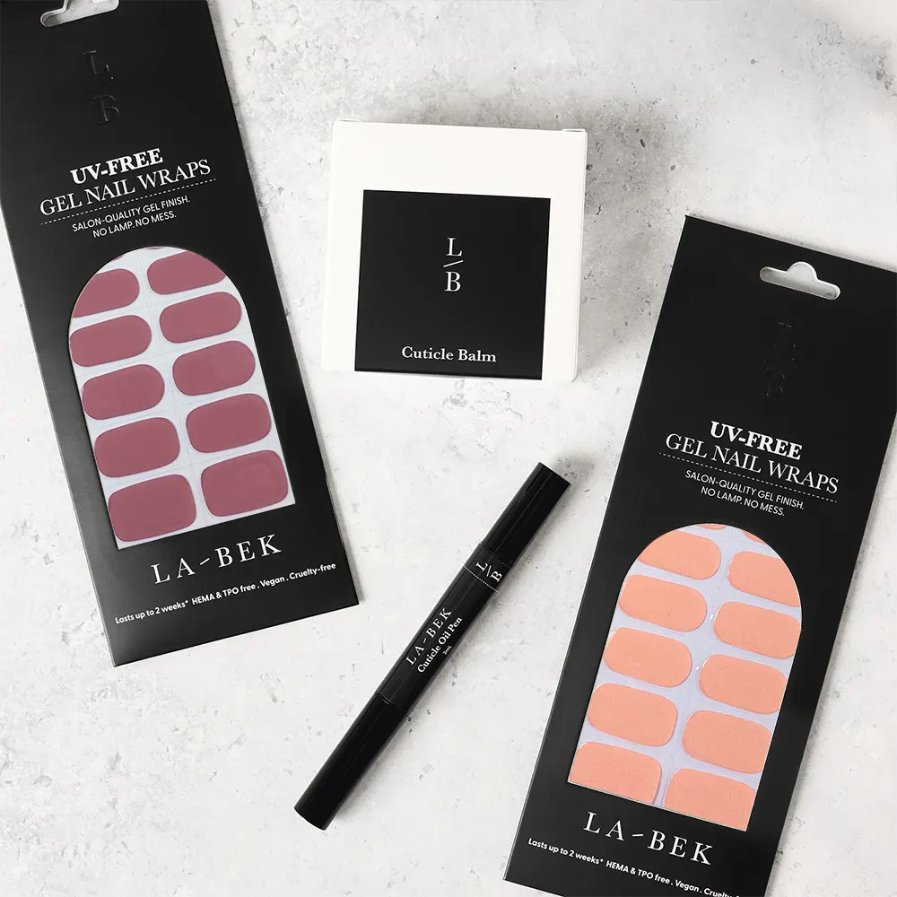 This starter set includes Cantaloupe and Rosewood nail sets, Cuticle Oil Pen and our Cuticle Balm — everything you need to try La-Bek for the first time with zero guesswork.