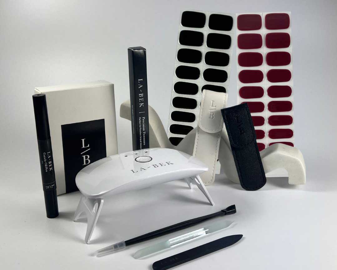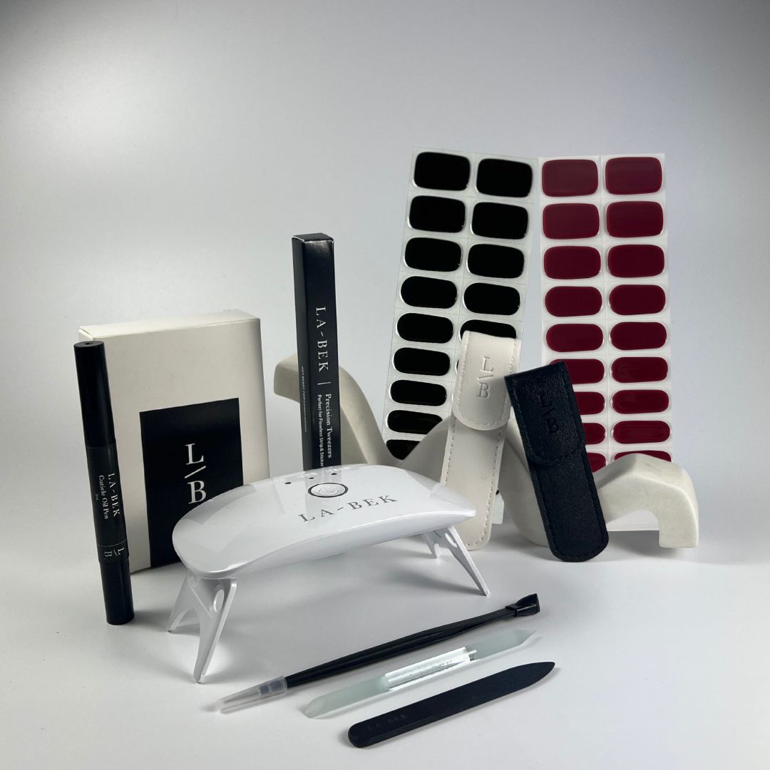 Includes our best-selling Night Black and Classic burgundy sets, UV lamp, cuticle oil pen, tweezers, and glass tool kit — your perfect La-Bek start.