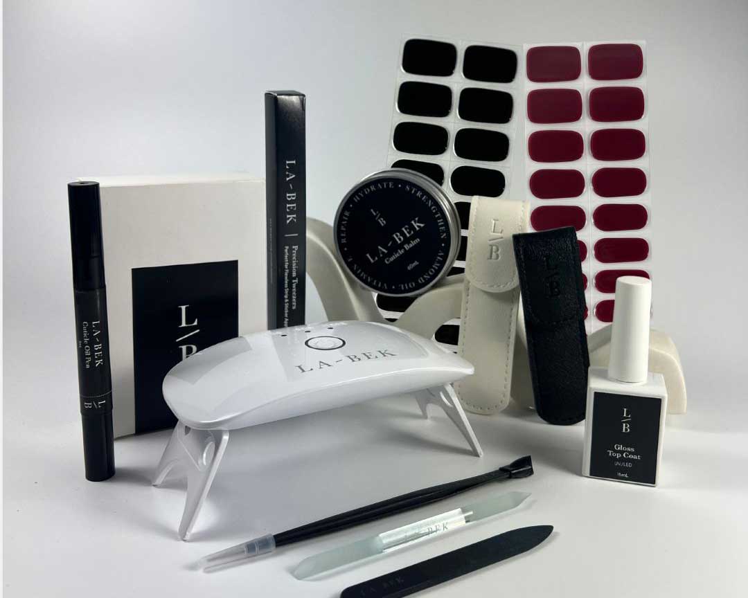 Includes Night Black and Classic Burgundy, UV lamp, cuticle oil pen, tweezers, glass tools — plus our Gloss Top Coat and nourishing Cuticle Balm for the ultimate La-Bek finish.