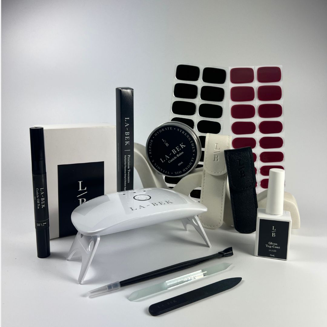 Includes Night Black and Classic burgundy, UV lamp, cuticle oil pen, tweezers, glass tools — plus our Gloss Top Coat and nourishing Cuticle Balm for the ultimate La-Bek finish.